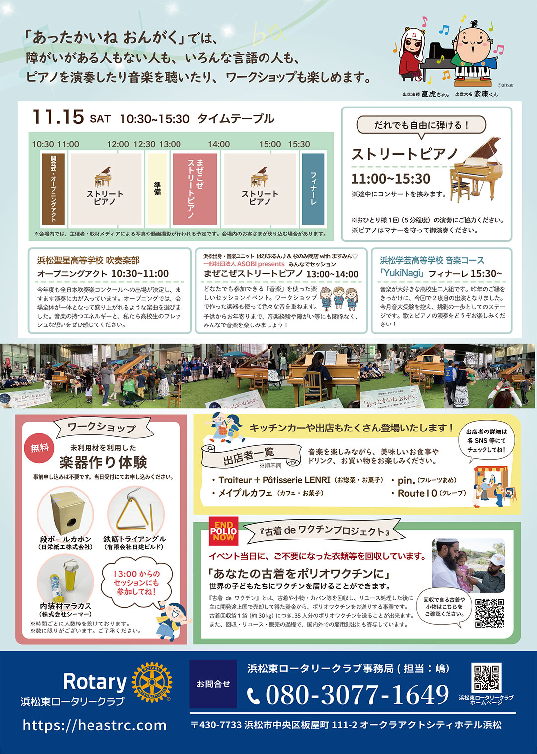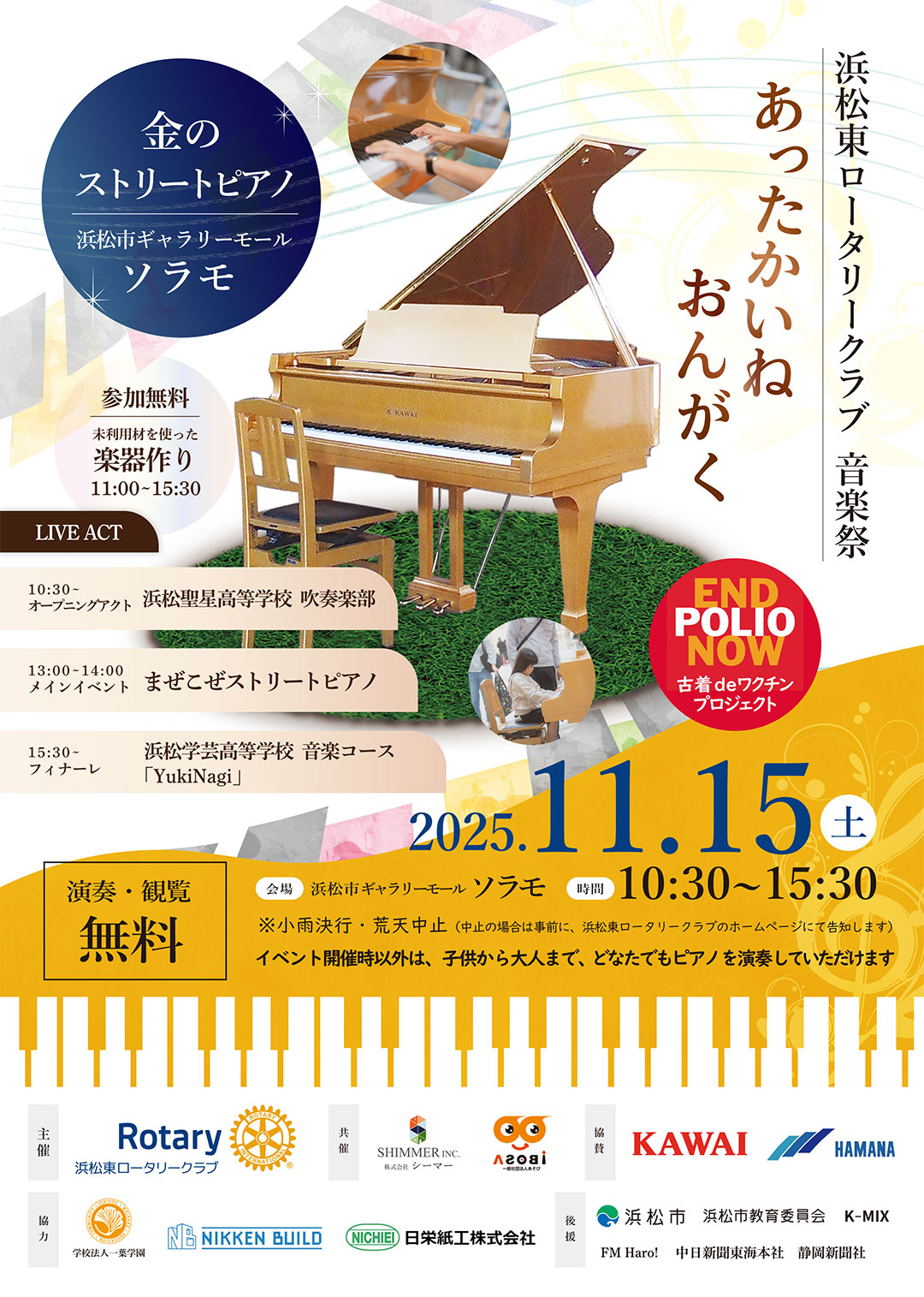 浜松市ギャラリーモール・ソラモにて、浜松東ロータリークラブ主催の音楽祭「あったかいね おんがく」が開催されます!