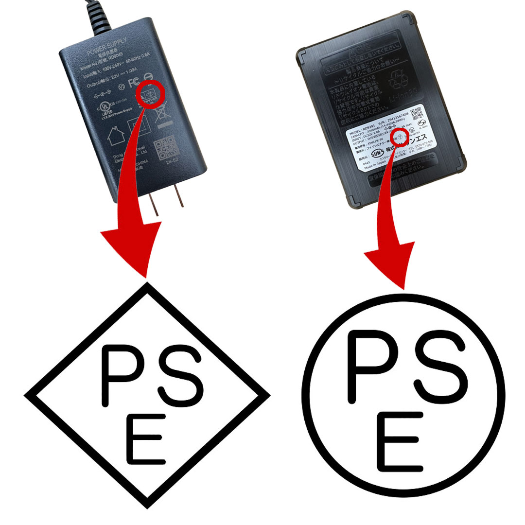PSEマークで説明すると、特定電気用品(例:ACアダプタや電気マッサージ器等)はひし形マーク表示対象、特定電気用品以外の電気用品(例:リチウムイオン蓄電池等)は丸形マーク表示対象となります。