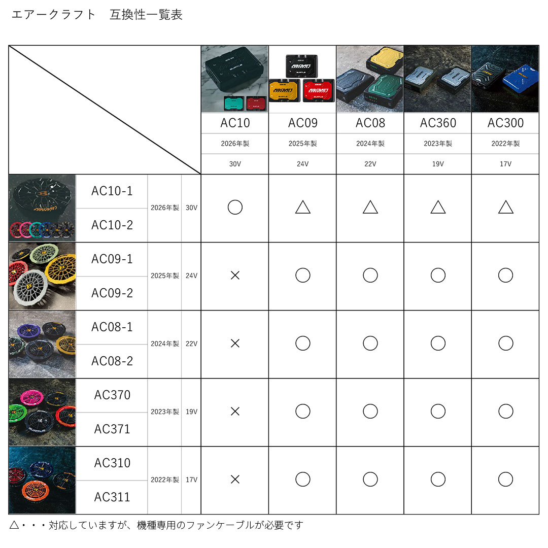 | 互換性(対応機種) | AC10 AC09 AC08 AC360 AC300 ※AC09~AC300のバッテリーを使用する場合には機種専用のファンケーブルが必要です |