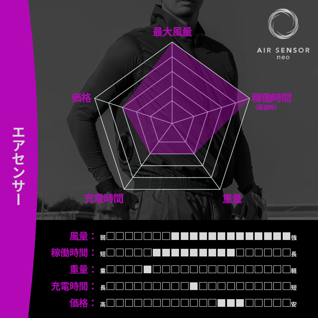 エアセンサーの特徴を一言で言うと、万人向けではなく、性能(風量)に振り切った空調ウェアです。