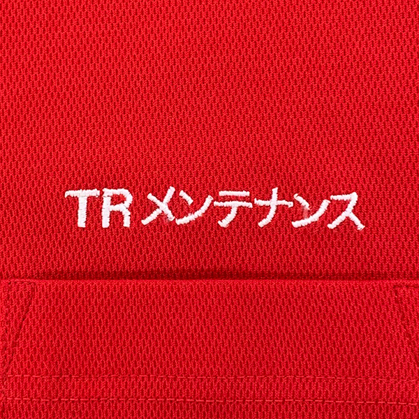 レッドのポロシャツに白の糸で加工をさせていただきました。