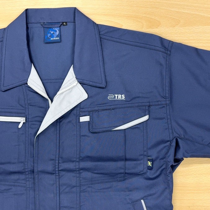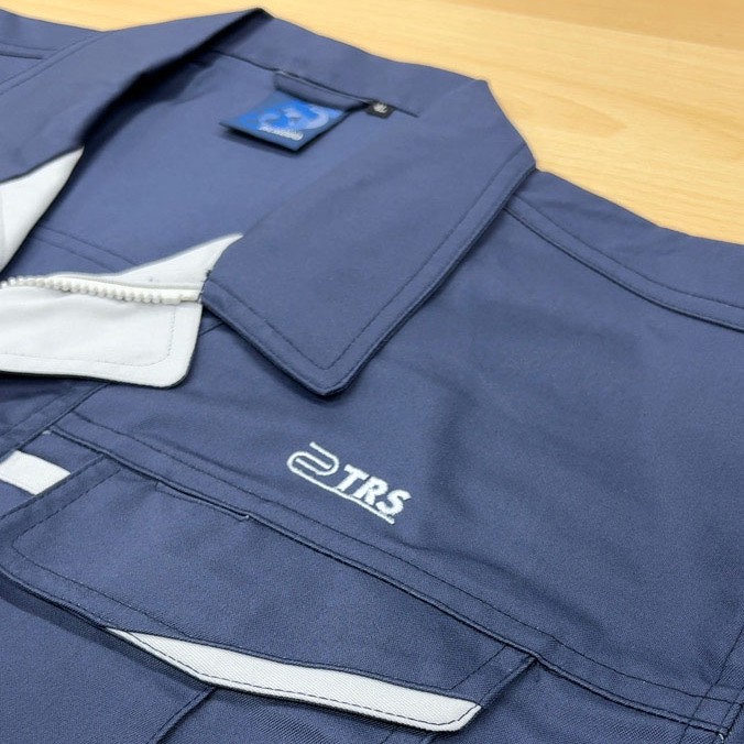 落ち着いたネイビー色の作業服に明るい銀色の刺しゅうがよく映える仕上がりとなっています。