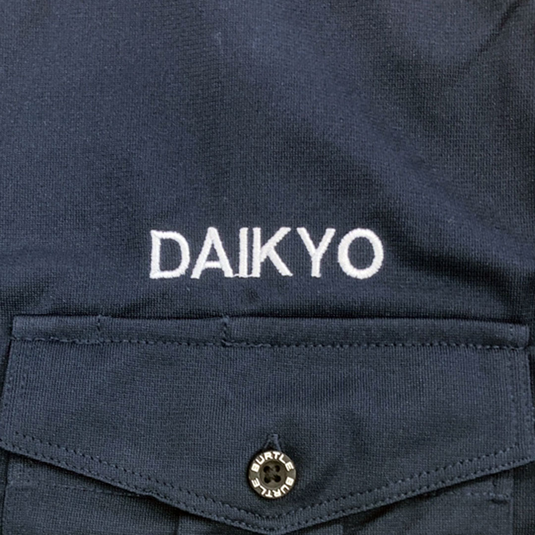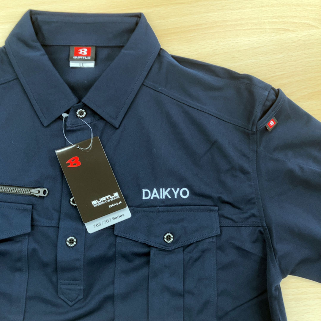 バートルのネイビーの人気定番ポロシャツに、銀の糸で加工をさせていただきました。